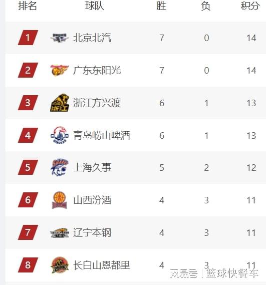 四冠王辽宁队,他们在这一轮比赛输给了广厦,球队目前的战绩是4胜3负,排名已经被北京、广东、广厦等队甩开差距,暂时排在积分榜第7位。吉林队这一战输给广州队以后,战绩也变成了4胜3负,排在积分榜第8位。积分榜第9名则是宁波队,这一轮比赛,他们以微弱的优势击败天津队以后,球队的战绩也变成了4胜3负。排在第10名的是同曦队,他们的战绩是3胜4负。