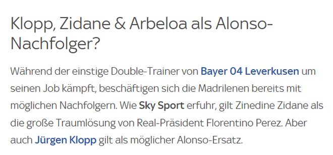 据了解,齐达内被认为是皇马主席弗洛伦蒂诺的首选。克洛普也被视为阿隆索的潜在替代者。