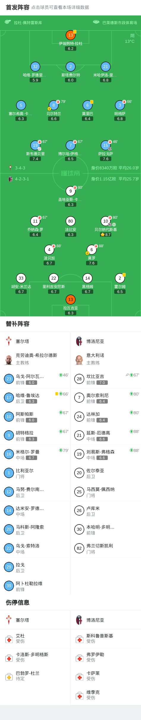 博洛尼亚2-1逆转塞尔塔,贝尔纳代斯基双响,萨拉戈萨破门