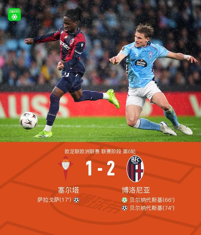 北京时间12月12日,欧足联欧洲联赛联赛阶段第六轮展开较量,塞尔塔迎战博洛尼亚。上半场,斯韦德贝里送出助攻,萨拉戈萨破门得分,为球队取得领先。下半场,贝尔纳代斯基主罚点球命中,帮助博洛尼亚扳平比分。比赛后段,坎比亚吉助攻贝尔纳代斯基再入一球,完成个人本场比赛的第二粒进球。最终,博洛尼亚客场2-1逆转塞尔塔。